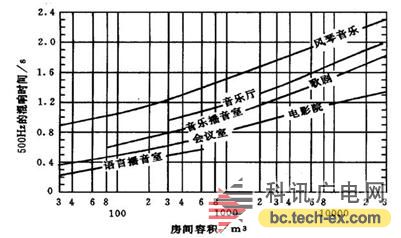 對混響時間進行計算,由此可見混響時間和建筑物的體積V,房間吸聲材料的平均吸聲系數