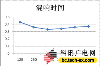 圖5為話筒在測試點實際記錄的掃頻信號波形,我們從中可以看出不同頻率在該點的振幅不同,并通過與原始掃頻信號的反卷積獲得沖擊響應波形,如圖6所示,前兩個小波峰是由于算法問題導致的不影響我們對房間沖擊響應做出判斷,只要關注最大的那個脈沖就是房間的脈沖響應。通過計算可以獲得房間的聲壓衰減平均曲線如圖7所示,聲壓從0.58s的位置開始衰減,最終獲得的混響時間如表1所示,不但可以獲得混響時間T20、T30的參數,同時還可以計算得到C50、C80、EDT等眾多聲學技術參數,如圖8所示為房間混響時間,其混響時間從125Hz-4000Hz基本在0.35s附近,且房間的混響時間較為平直。